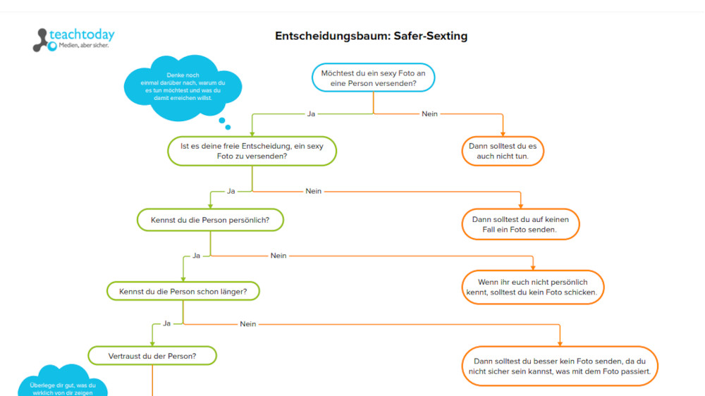 Sexting sicher handhaben: Der Entscheidungsbaum dient als Leitfaden, um Jugendlichen bei der Bewertung der Situation zu helfen und ihnen Handlungsoptionen aufzuzeigen.